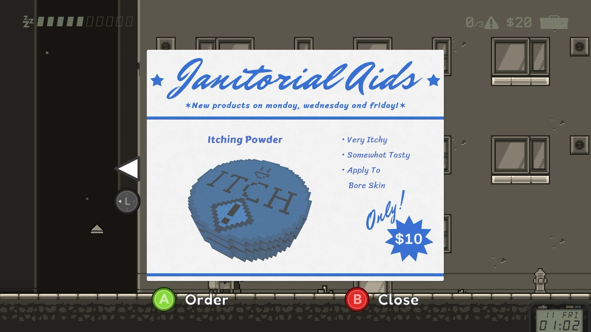 Bad Janitor - это тёмно-комедийный хаос под прикрытием: ты - уборщик CityGrind Corp, который по заданию корпорации тихо докучает жильцам, чтобы пустые квартиры пошли под снос и выросли красивые офисные башни. Вломы, швабра как шпионский гаджет, пылесос с сюрпризом - мешай расписания, теряй ключи и делай жизнь соседей невыносимой, но не забывай подметать, чтобы не поднять подозрений. Карьерный режим - 20 зданий с нарастающей жестью, после прокачки откроется фриланс с кастомными домами и прокачкой персонажа; выбрать можно из трёх разных уборщиков, а жильцы - в 15 вариациях с личным таймингом и уязвимыми местами. В арсенале от швабры до хитрых подсказок, плюс встроенный плеер на 11 трэков - идеальный саундтрек для пакостей. Представь смесь Office Space и Home Alone, только вместо валенок - моп и корпоративная бездушная улыбка: грязный юмор, мелкие пакости и большой план по застройке города.