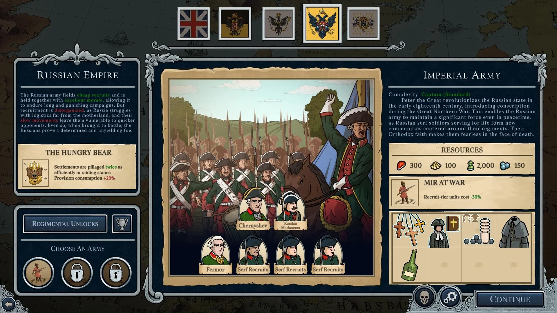 - Найм и торговля - города дают провиант, офицеров или артиллерию, цены меняются от твоих действий.