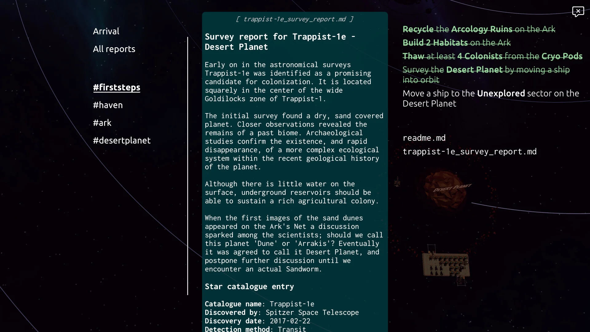 Trappist - это спокойная сюжетная игра-построитель с управлением ресурсами в системе Trappist‑1. Вы командуете Аркой - крупным подвижным кораблём и торговым хабом - исследуете систему, выбираете места для колоний, раскапываете инопланетные артефакты и раскрываете загадки Trappist‑1. Стройте базы на планетах и лунах, настраивайте производство и автоматические торговые маршруты между колониями, заменяйте рабочую силу роботами и меняйте размещение зданий между сеткой и свободным режимом. Игра проста в освоении, позволяет добиваться заметного прогресса за короткие сессии, включает несколько сюжетных веток, около 10-15 часов текущего контента, шесть уникальных локаций и более 50 типов зданий; проект продолжает развиваться.