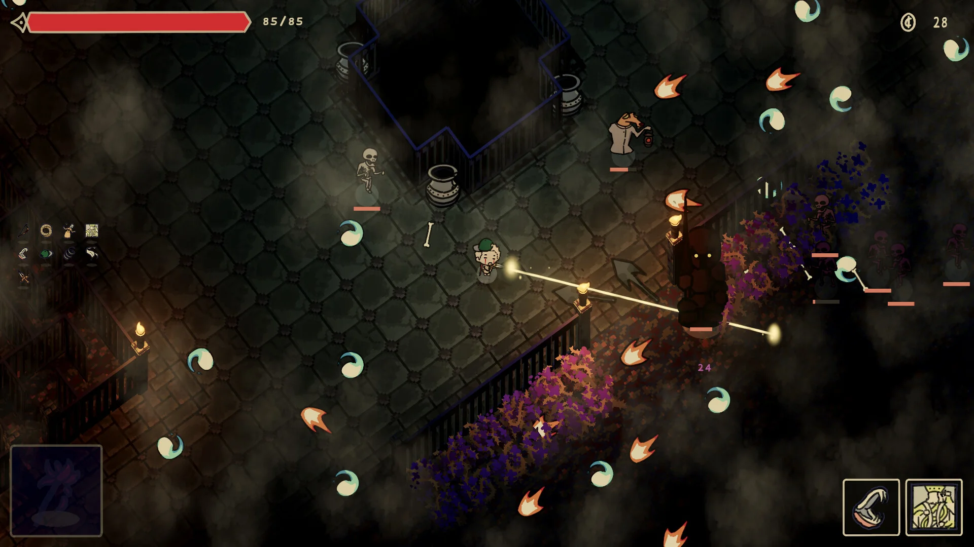 В игре больше 20 тяжелых сражений с боссами, каждый из которых обладает собственной механикой, а также множество уникальных врагов в разных локациях. Вас ждут более 100 предметов, которые выпадают с обычных противников и могут заметно менять стиль игры. Система прокачки позволяет собрать как хрупкого, но смертоносного бойца, так и стойкого танка.