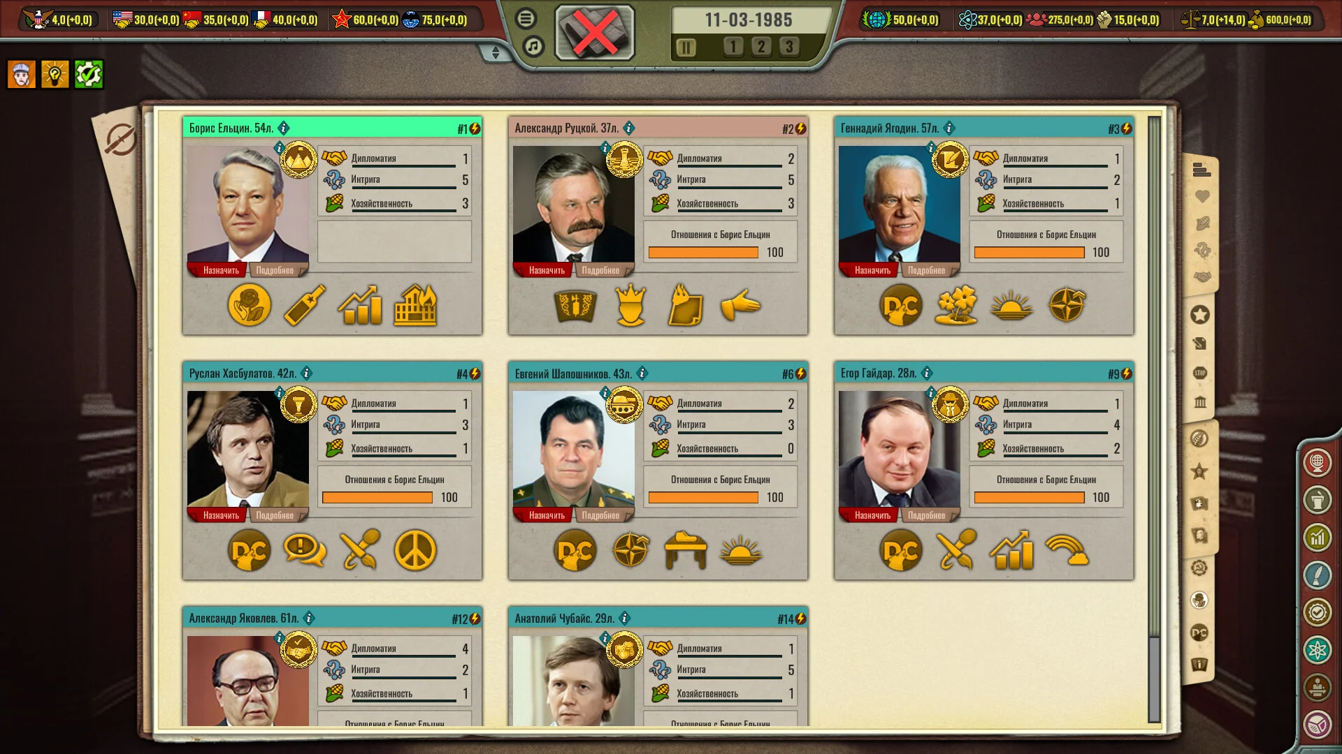 Погрузитесь в атмосферу холодной войны и альтернативной истории, где каждый выбор может привести СССР к возрождению социализма, осторожным реформам, жесткому консерватизму или даже распаду. Взаимодействуйте с десятками государств, заключайте союзы, ведите дипломатические переговоры, участвуйте в прокси-войнах и влияйте на мировую историю, меняя баланс сил на планете.