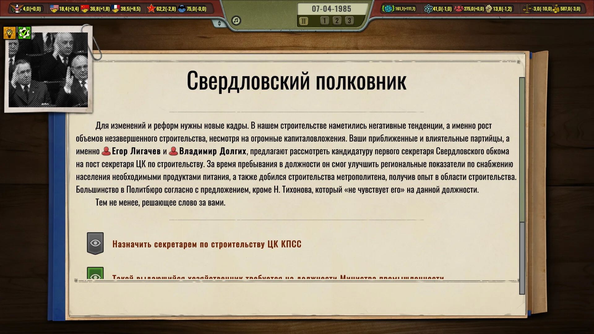 Сотни решений, сложные последствия и десятки уникальных концовок делают каждое прохождение неповторимым. Сможете ли вы сохранить союз, превратить СССР в новую мировую силу или привести страну к совершенно иному будущему?
